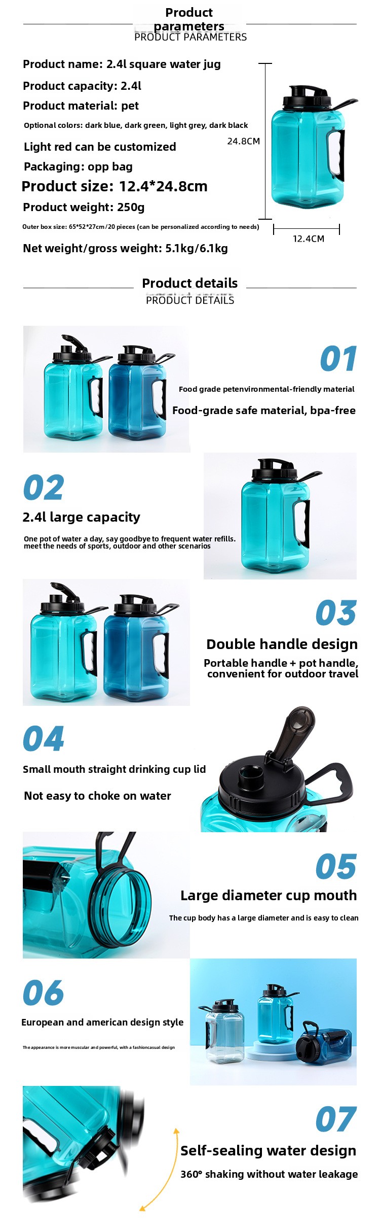 Large Capacity: 2.4L volume ideal for extended outdoor activities and workouts
